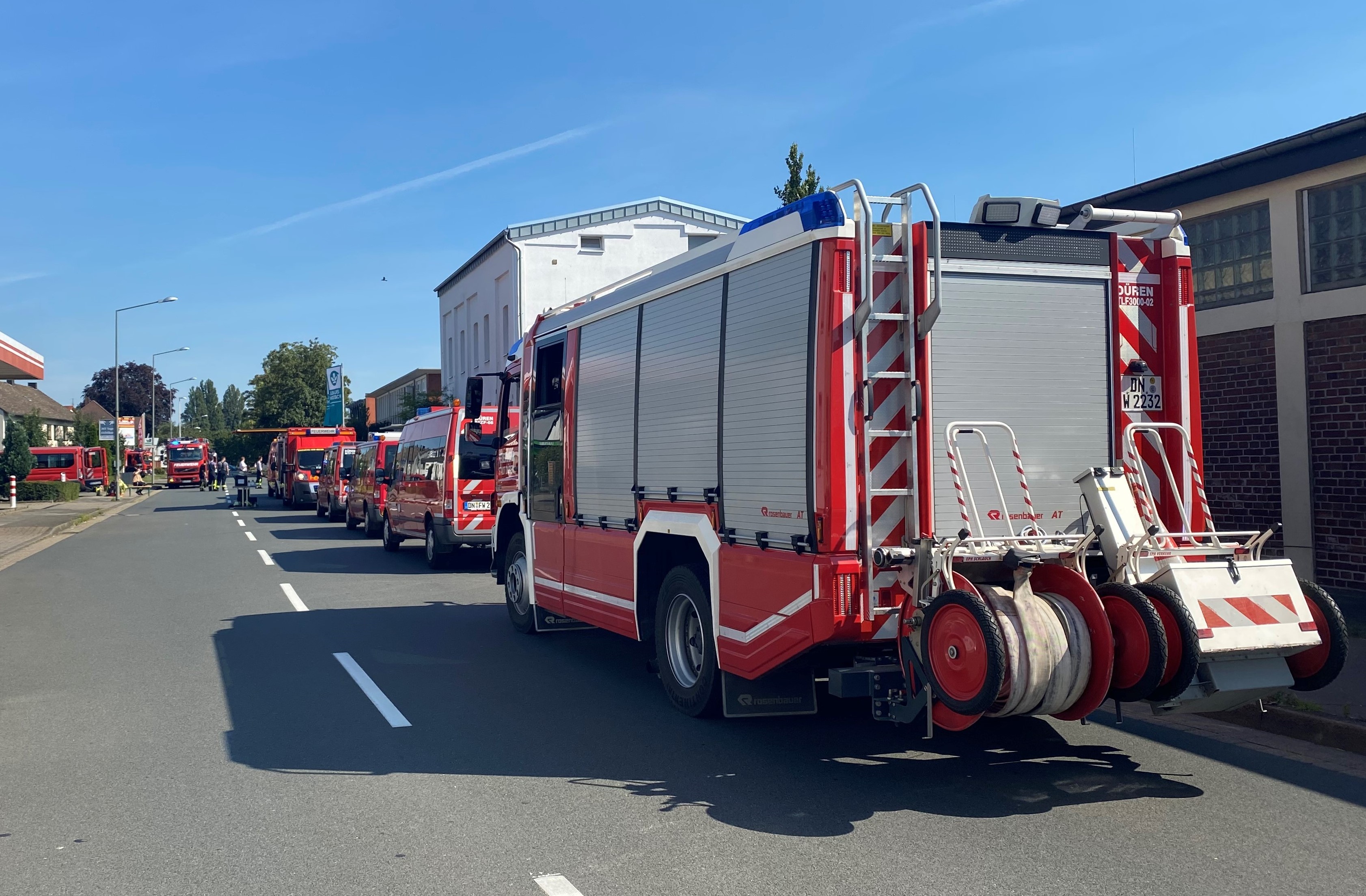 Insgesamt waren 105 Feuerwehrangehörige der Feuerwehr Düren (hier: Löschgruppen Merken, Mariaweiler, Echtz, Birkesdorf, Arnoldsweiler, Derichsweiler, Gürzenich, Birgel, FÜG, ABC-Zug 503 und Löschzug Mitte) und der Feuerwehr Kreuzau (hier: Messzug und Angehörige des ABC-Zugs 503) eingesetzt.