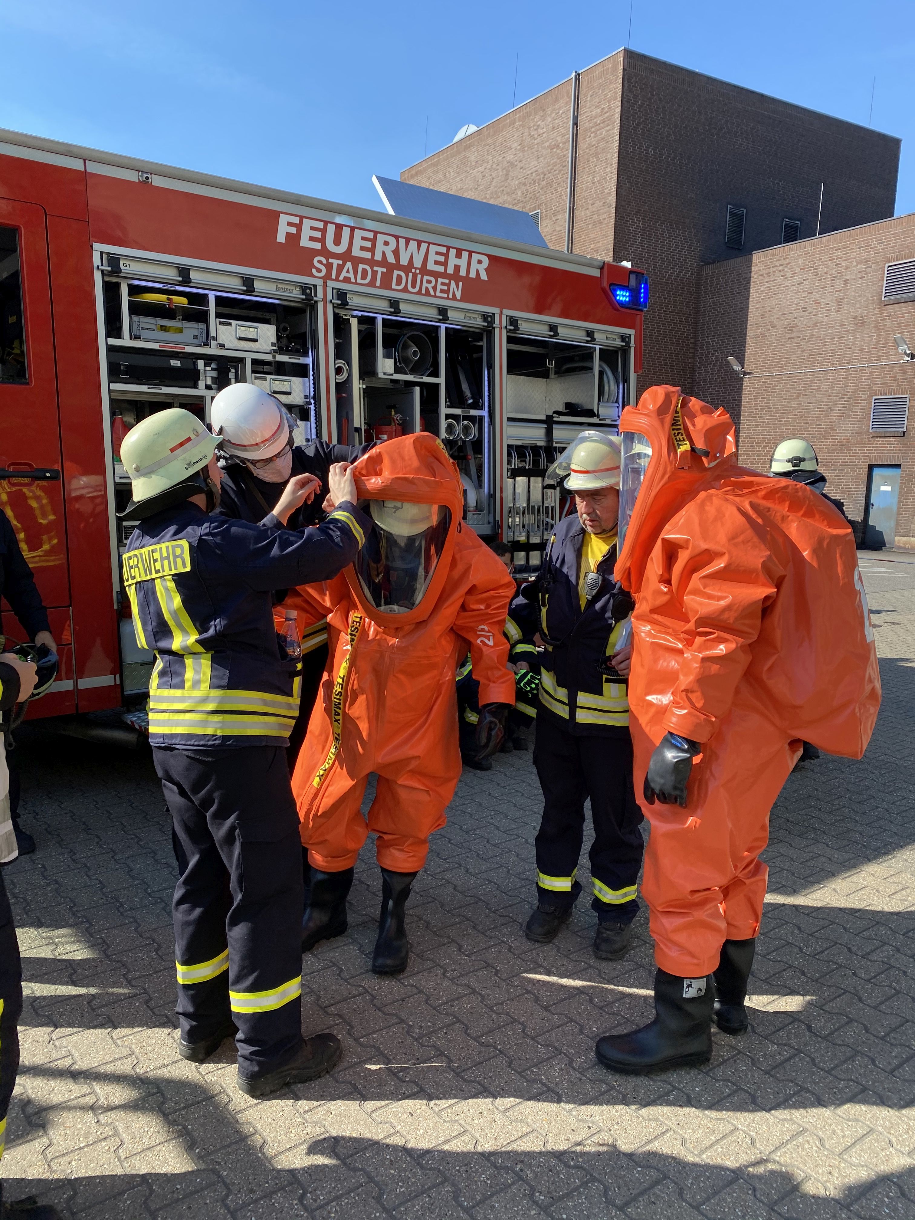 Die Feuerwehr Düren wurde gegen 14:45 Uhr zu einem vermeintlichen Brand im Ortsteil Hoven alarmiert. In einem Betrieb kam es zu einem Störfall wobei geringe Mengen ätzende Dämpfe aus einem beschädigten Behälter