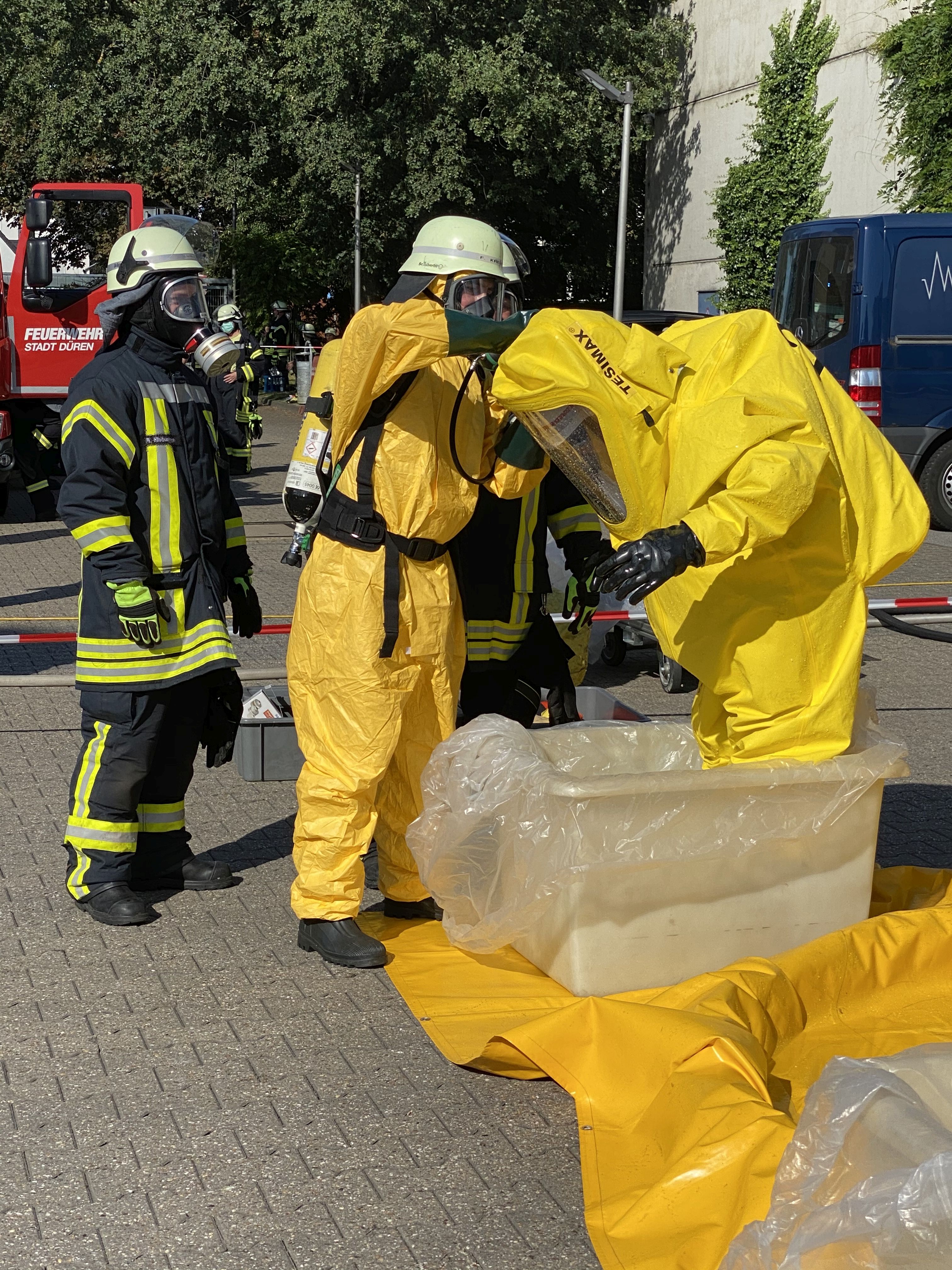 (Behältergrösse: ≤ 1 m³) freigesetzt wurden. Die Betriebsangehörigen leiteten erste Gefahrenabwehrmassnahmen ein. Die eintreffende Feuerwehr schlug die Dämpfe mit Wasser nieder und führte Messungen durch, um den Stoff und die Konzentrationen zu ermitteln. Nach der Bewertung der gesammelten Ergebnisse konnte - auch in Abstimmung mit dem Fachberater Chemie des Kreises Düren - festgestellt werden, dass eine Gefährdung der Bevölkerung und der Umwelt ausgeschlossen werden kann. Der Inhalt des beschädigten Behälters wurde durch die Feuerwehr in einem geeigneten Behälter unter Atemschutz und Schutzanzügen umgefüllt. Der beschädigte Behälter verblieb, in Abstimmung mit der Aufsichtsbehörde, auf dem Werksgelände.