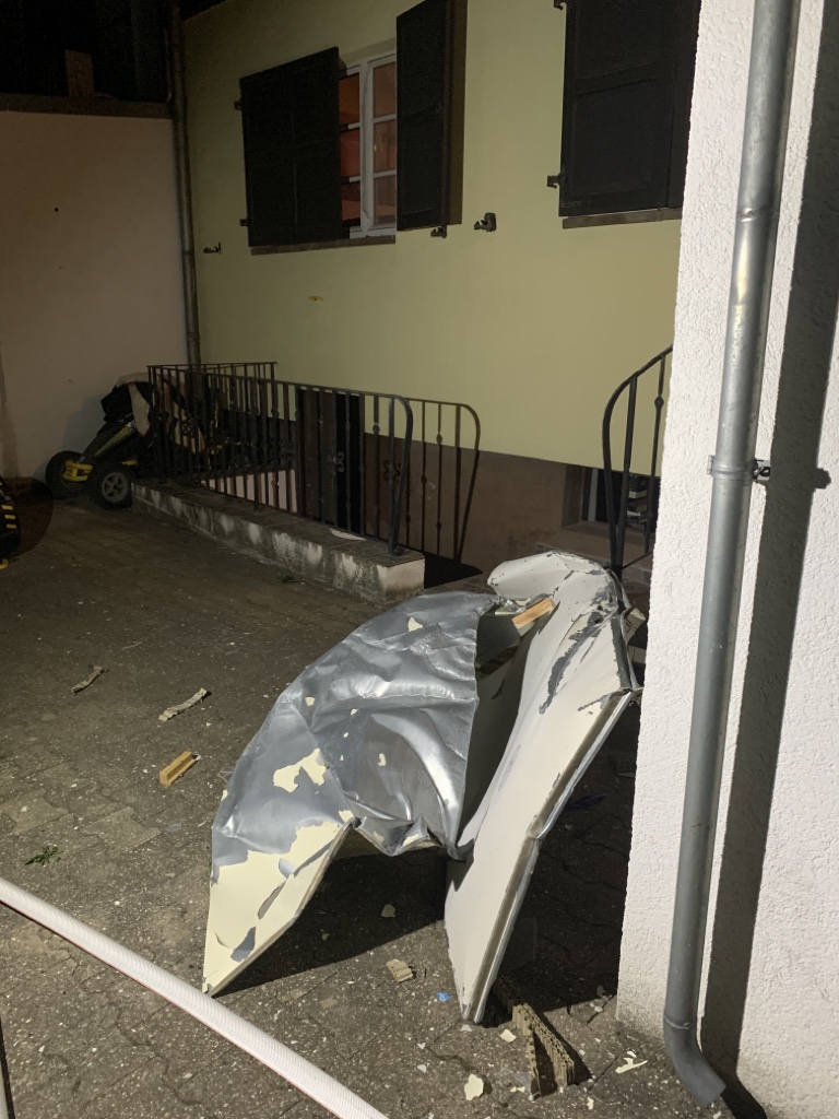 Propan in den Keller des Einfamilienhauses und bildete dort eine explosionsfähige Atmosphäre. Gegen 23:00 Uhr entzündete sich dieses Gemisch im Heizungsraum des Hauses. Die Druckwelle war so stark, das die Metalleingangstüre des Kellers massiv beschädigt wurde sowie Fenster im Keller zerbrachen. Glücklicherweise wurde durch die Explosion niemand verletzt. Die undichte Stelle konnte durch die Feuerwehr mit Hilfe des Gasversorgers gefunden und anschließend beseitigt werden. Das ausgetretene Gas wurde mittels Lüfter verdrängt und der Keller freigemessen.