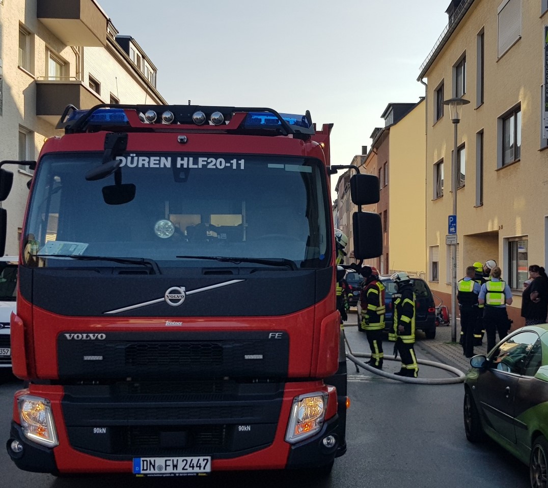 glücklicherweise vor Eintreffen der Feuerwehr bereits geräumt. Der vorgehende Trupp konnte einen schnellen Löscherfolg verbuchen. Ein Übergreifen der Flammen auf andere Räume der Wohnung konnte verhindert werden. Die Wohnung musste vorübergehend stromlos geschaltet werden. Die Bewohnerin konnte bei Bekannten unterkommen. Neben der Hauptwache waren der Löschzug Mitte ,die Löschgruppe Lendersdorf und die Führungsunterstützungsgruppe alarmiert. Insgesamt waren 25 Feuerwehrleute im Einsatz.