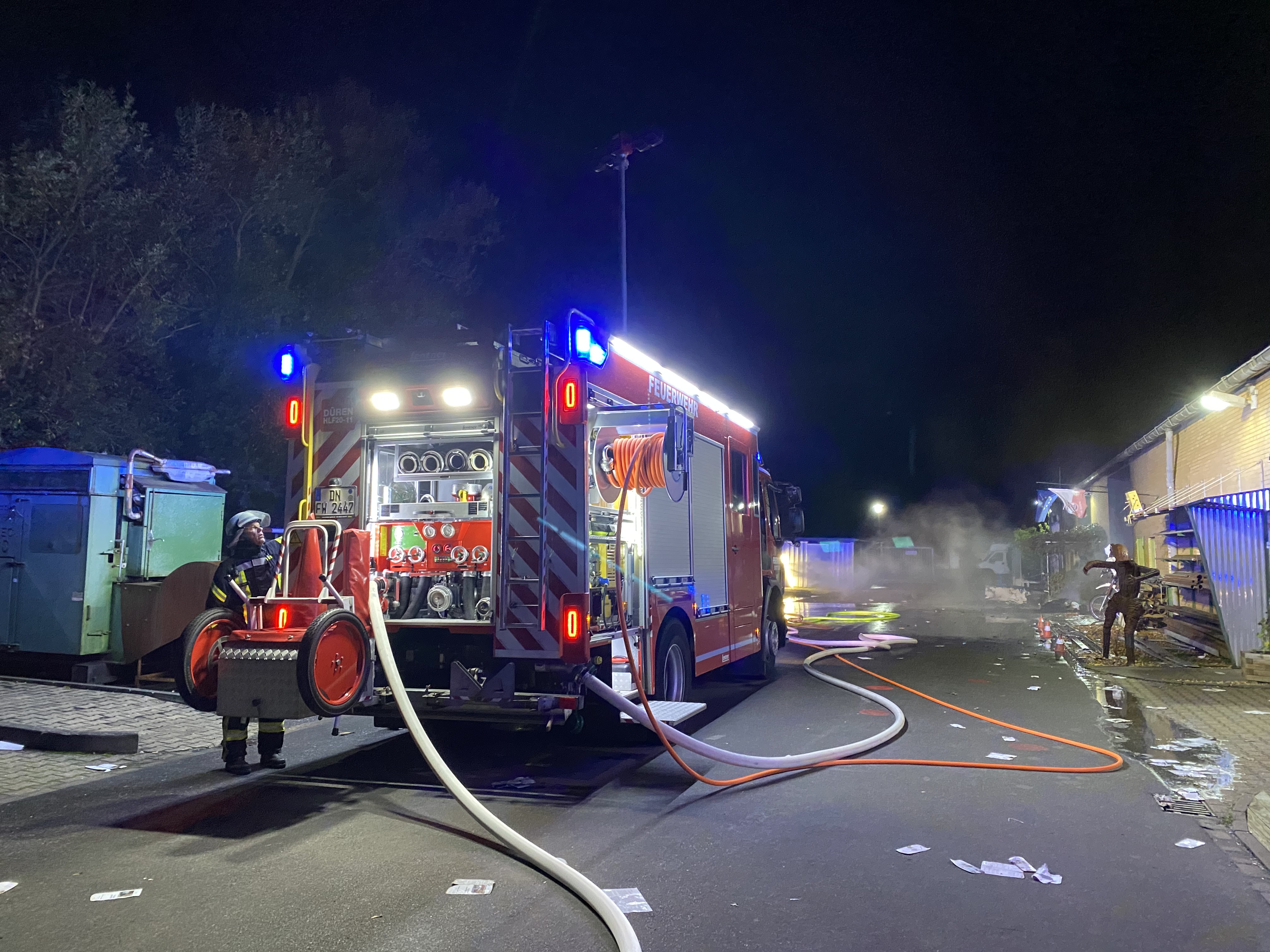 Feuerwehr meldete die Leitstelle des Kreises Düren mehrere Anrufer, die einen Feuerschein und mehrere Explosionsgeräusche angaben. Die unmittelbar eingeleitete Erkundung auf dem weitläufigen Areal bestätigte ein Feuer im Außengelände, dass auf einen angrenzenden Werkstattbereich überzugreifen drohte. Die Alarmstufe wurde umgehend erhöht, so dass neben der bereits alarmierten Hauptwache, der Löschzug Mitte, die Löschgruppe Birkesdorf und der Führungsdienst hinzugezogen wurden.