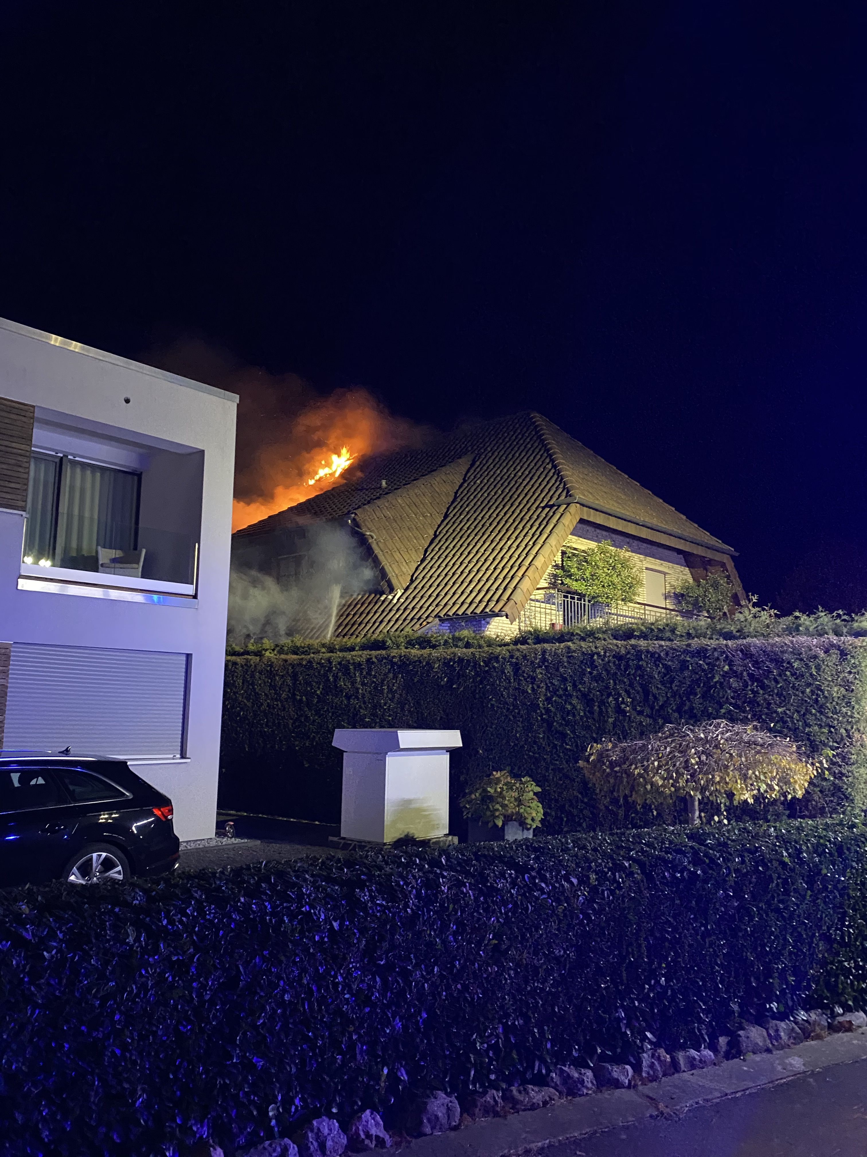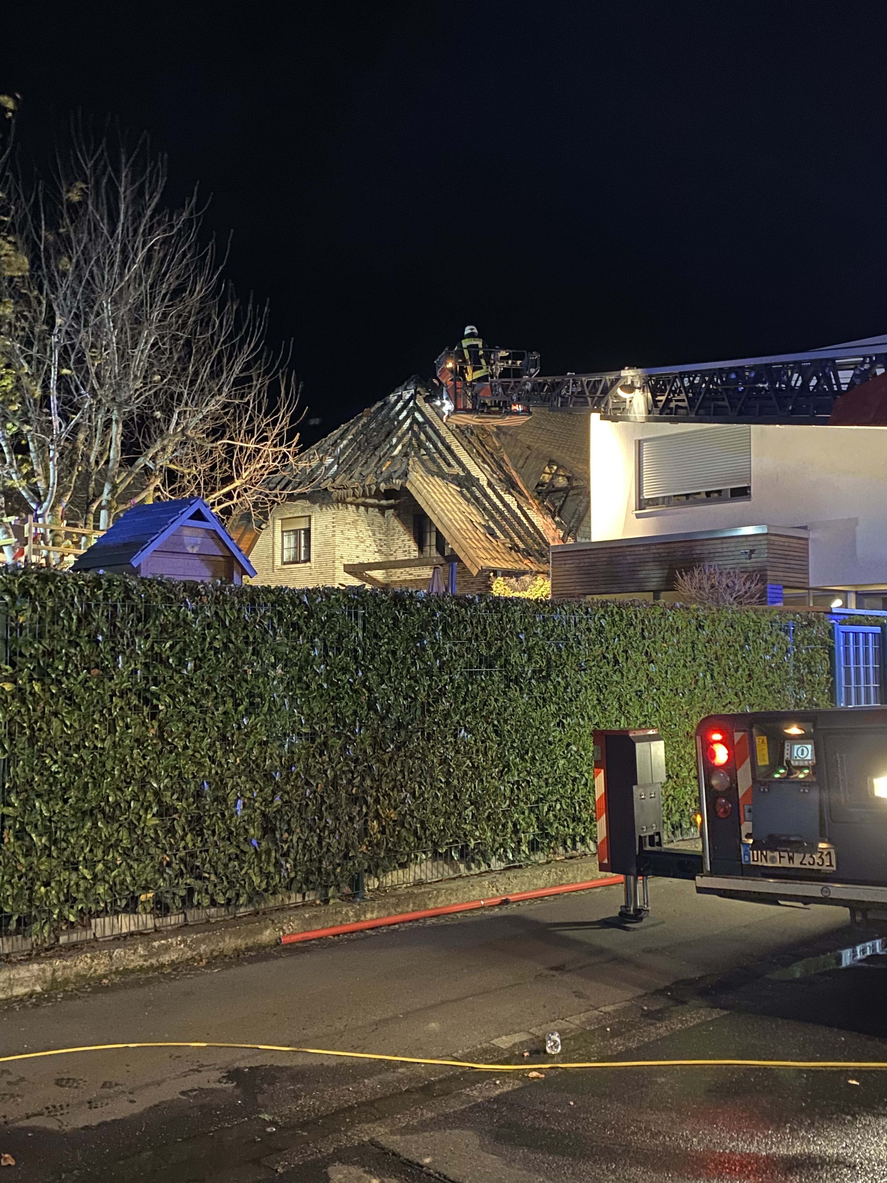 eine Person schwer verletzt wurde. Ein weiterer Unfall auf der B 56 ereignete sich gegen 0:00 Uhr. Bei einem Auffahrunfall stadtauswärts wurden 2 Personen schwer verletzt. Zur schonenden Rettung der Verletzten musste durch die Feuerwehr das Dach des Pkw abgenommen werden. Um 2:30 Uhr erfolgte dann die Alarmierung zu einem Wohnhausbrand im Stadtteil Gürzenich. Da hier Personen vermisst wurden, eröffnete die Leitstelle mit dem Stichwort "Menschenleben in Gefahr". Auf Anfahrt war schon ein deutlicher Feuerschein zu erkennen. Beim Eintreffen der Feuerwehr stand das Dachgeschoss nahezu im Vollbrand. Da unklar war, ob sich noch Personen im Haus befanden, wurde sofort eine Personensuche eingeleitet. Bei der weiteren Erkundung stellte sich schnell heraus, dass sich niemand im Objekt befand. Neben der Brandbekämpfung im Innenangriff wurde eine massive Brandbekämpfung von außen mit mehreren handgeführten Rohren und einem Wenderohr über die Drehleiter eingeleitet. Nach rund einer halben Stunde konnte der Leitstelle gemeldet werden, dass das Feuer unter Kontrolle ist. Im Anschluss waren umfangreiche Nachlöscharbeiten erforderlich. Unter anderem mussten Teile des Daches von innen und außen geöffnet werden. Vor Ort waren rund 70 Einsatzkräfte der Feuerwehr Düren.