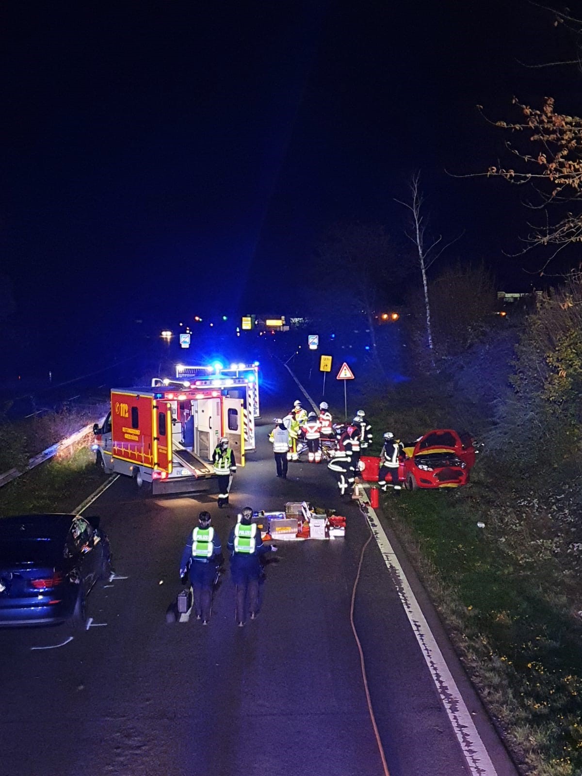 Gegen 21:00 Uhr musste die Feuerwehr Düren zu einem schweren Verkehrsunfall auf die B 56 ausrücken. Aufgrund eines Falschfahrers kam es hier zu einem Frontalzusammenstoß, bei dem
