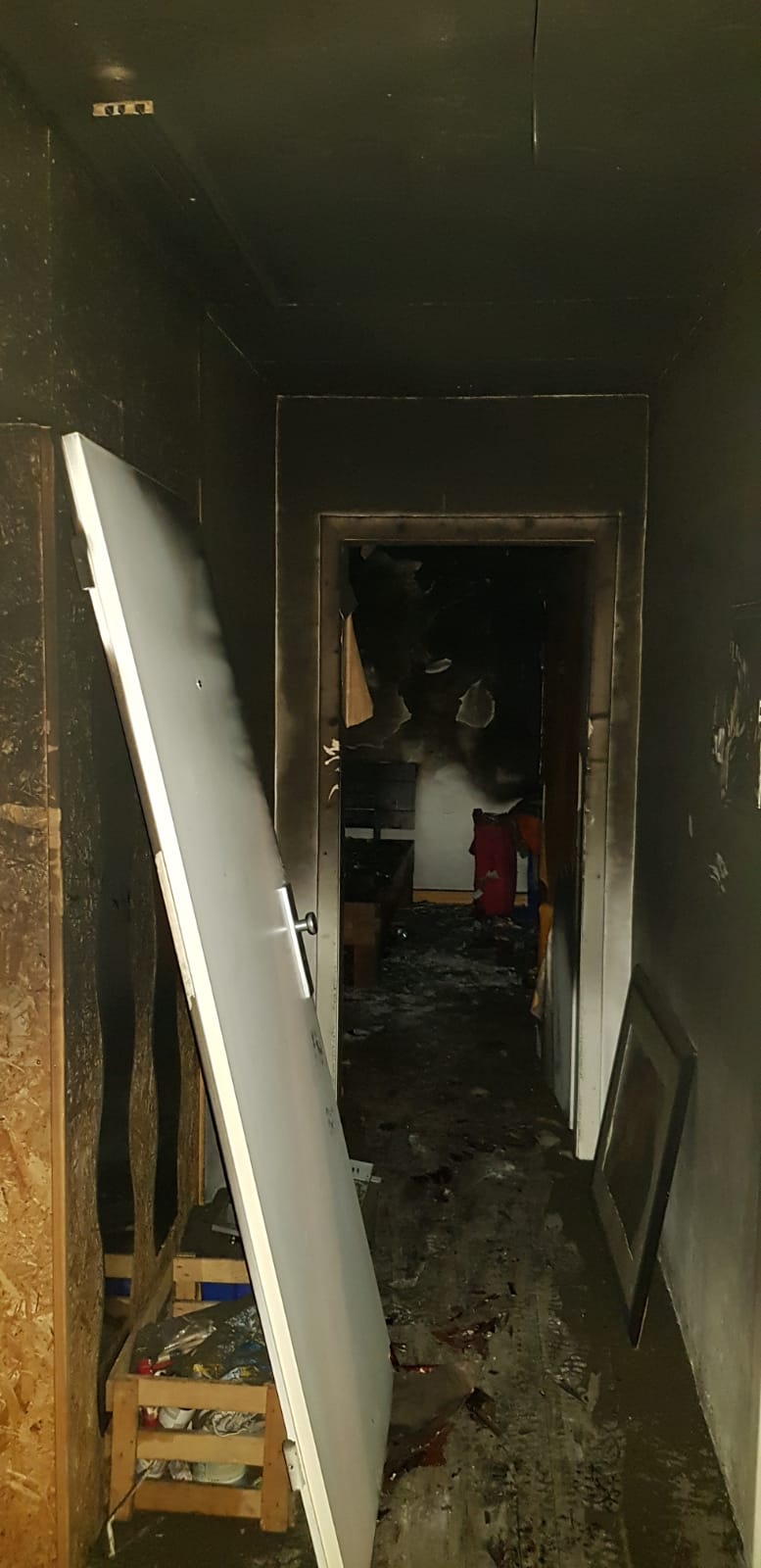 Vor Ort konnte die Meldung der Anrufer bestätigt werden. Die Dachgeschosswohnungstür hatte sich aufgrund austretendem Rauch an den Seiten schwarz verfärbt, sodass von einem Brand in der Wohnung ausgegangen werden konnte. Sofort wurde ein Trupp mit Atemschutzgerät zur Menschenrettung und anschließender Brandbekämpfung in die Wohnung geschickt. Zwischenzeitlich traf der Mieter der Wohnung ein, sodass keine Person mehr vermisst wurde. In der Wohnung konnte eine starke Verrauchung, jedoch kein Feuer mehr festgestellt werden. Vermutlich hatte sich das Feuer vor Eintreffen der Feuerwehr schon selbst aufgrund von Sauerstoffmangel bzw. Brennstoffmangel gelöscht. Die Wohnung, sowie die Bereiche neben der Wohnung, wurden durch die Feuerwehr mittels Wärmebildkamera kontrolliert. Aufgrund der Einwirkung des Feuers und der heißen Rauchgase ist die Wohnung nicht mehr bewohnbar.