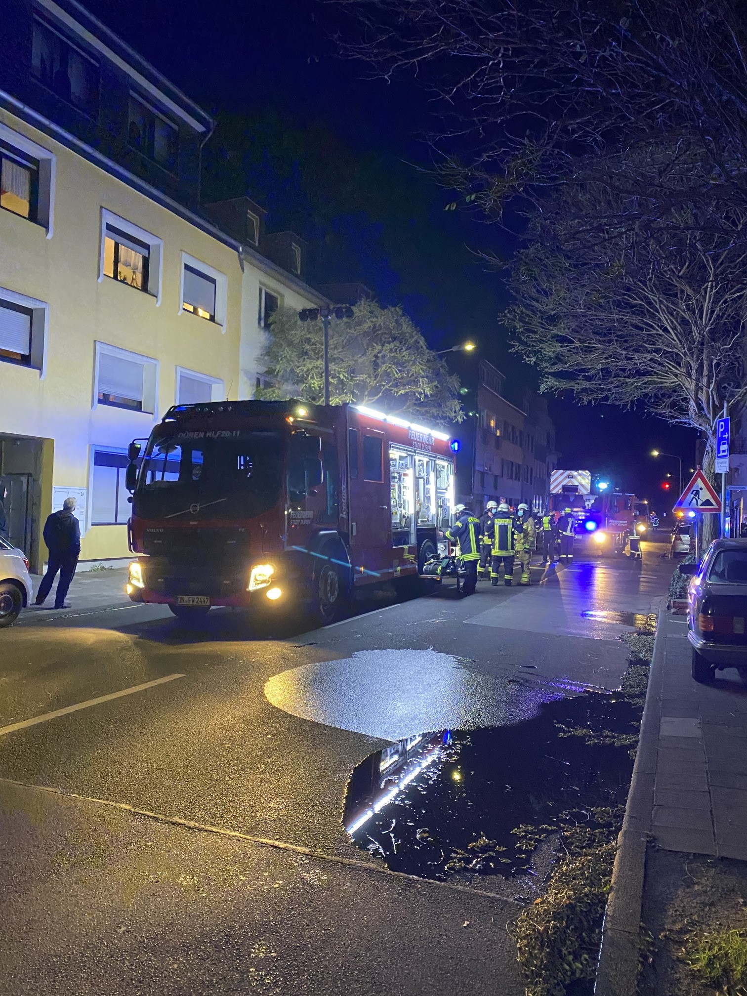 Wohnungstür im Dachgeschoss eines Mehrfamilienhauses in der Rurstraße. Ob sich noch jemand in der Wohnung befand, konnte zu diesem Zeitpunkt noch nicht bestimmt werden. Die Leitstelle des Kreises Düren entsandte umgehend die hauptamtliche Wache, den Einsatzführungsdienst und mehrere Einheiten des Ehrenamtes.