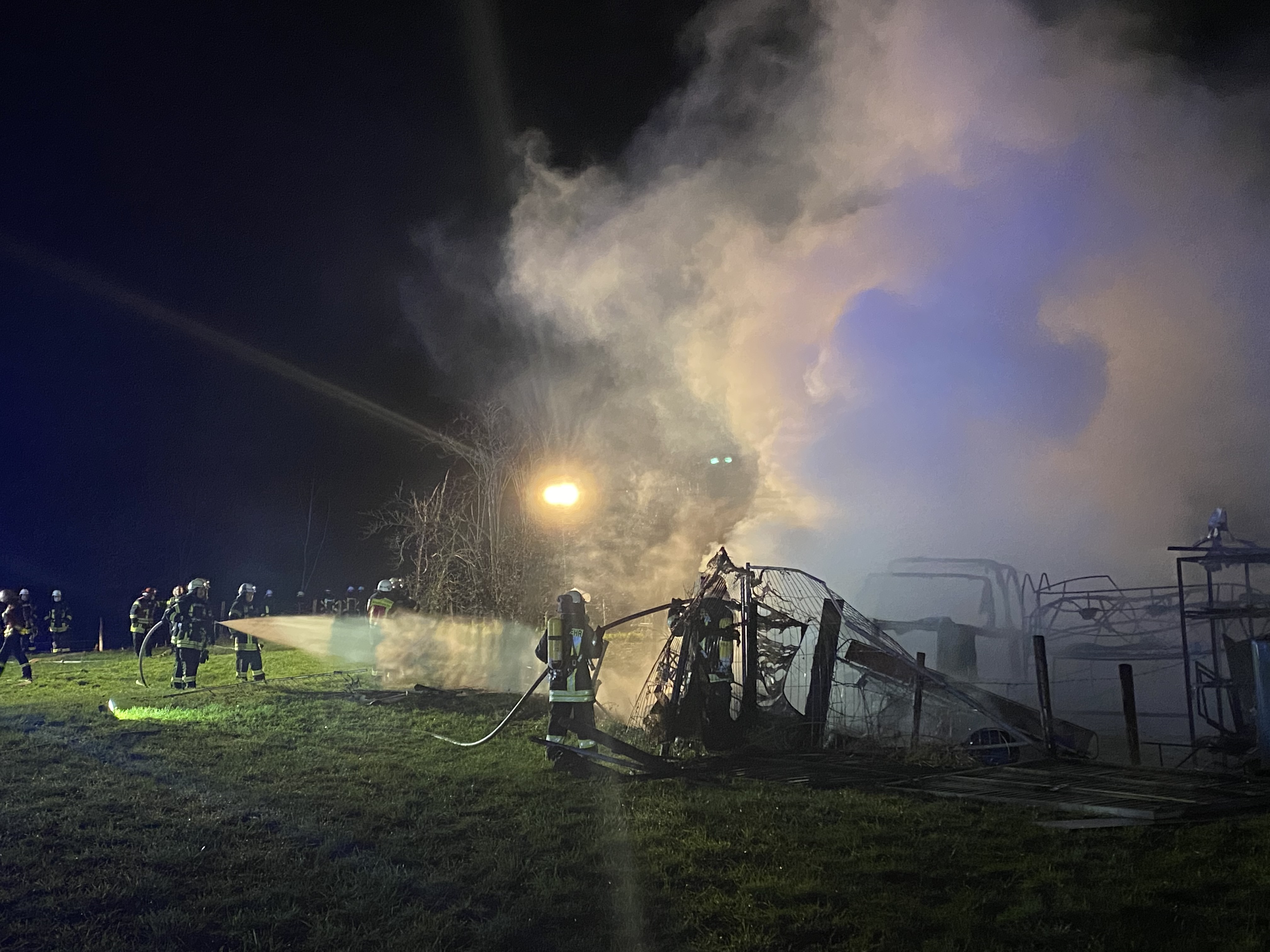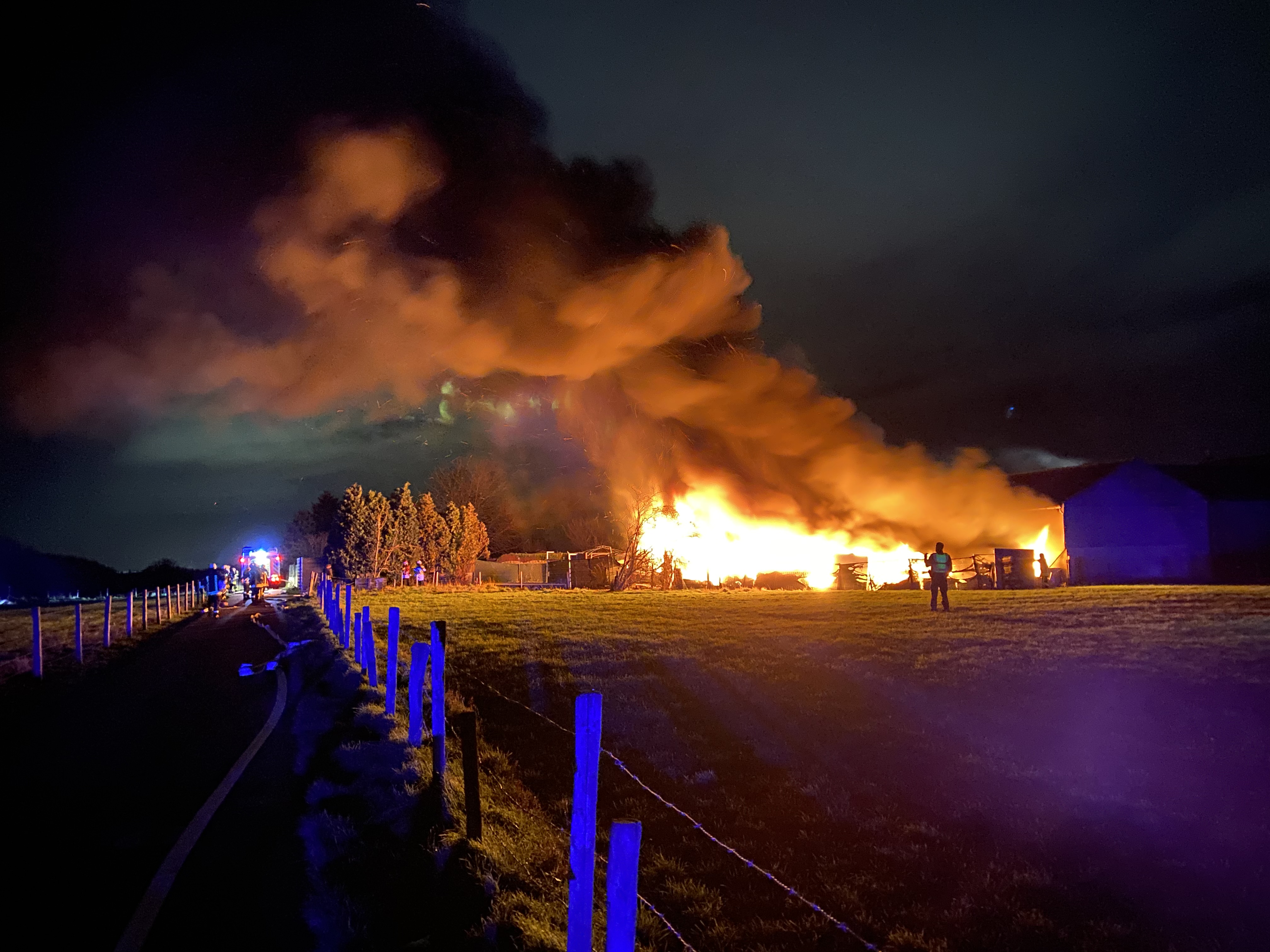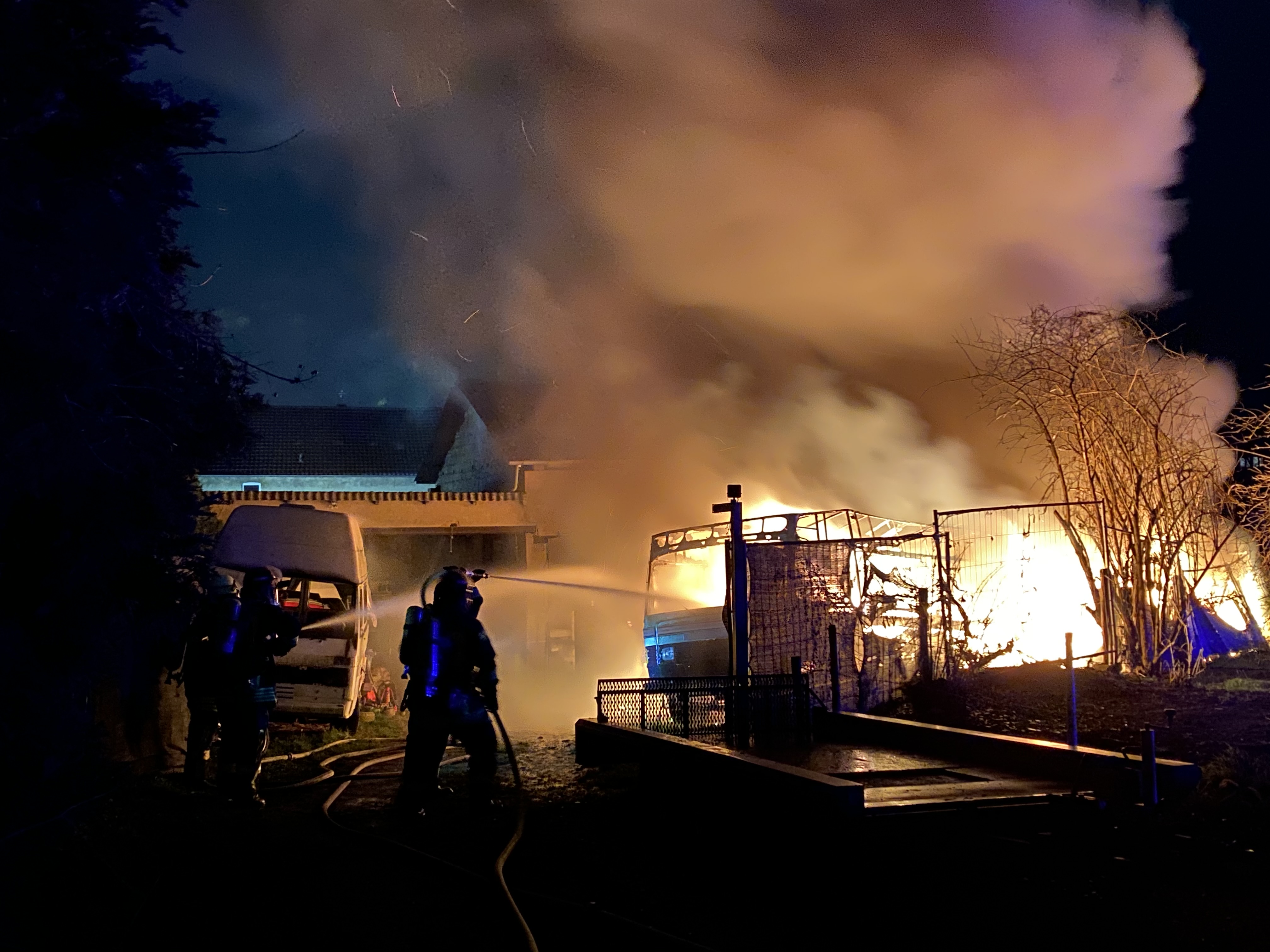 Die Feuerwehr Düren wurde die Nacht um 03:30 zu einem Scheunenbrand in Merken gerufen. Vor Ort konnte festgestellt werden, das mehrere Fahrzeuge hinter der Scheune brannten. Durch