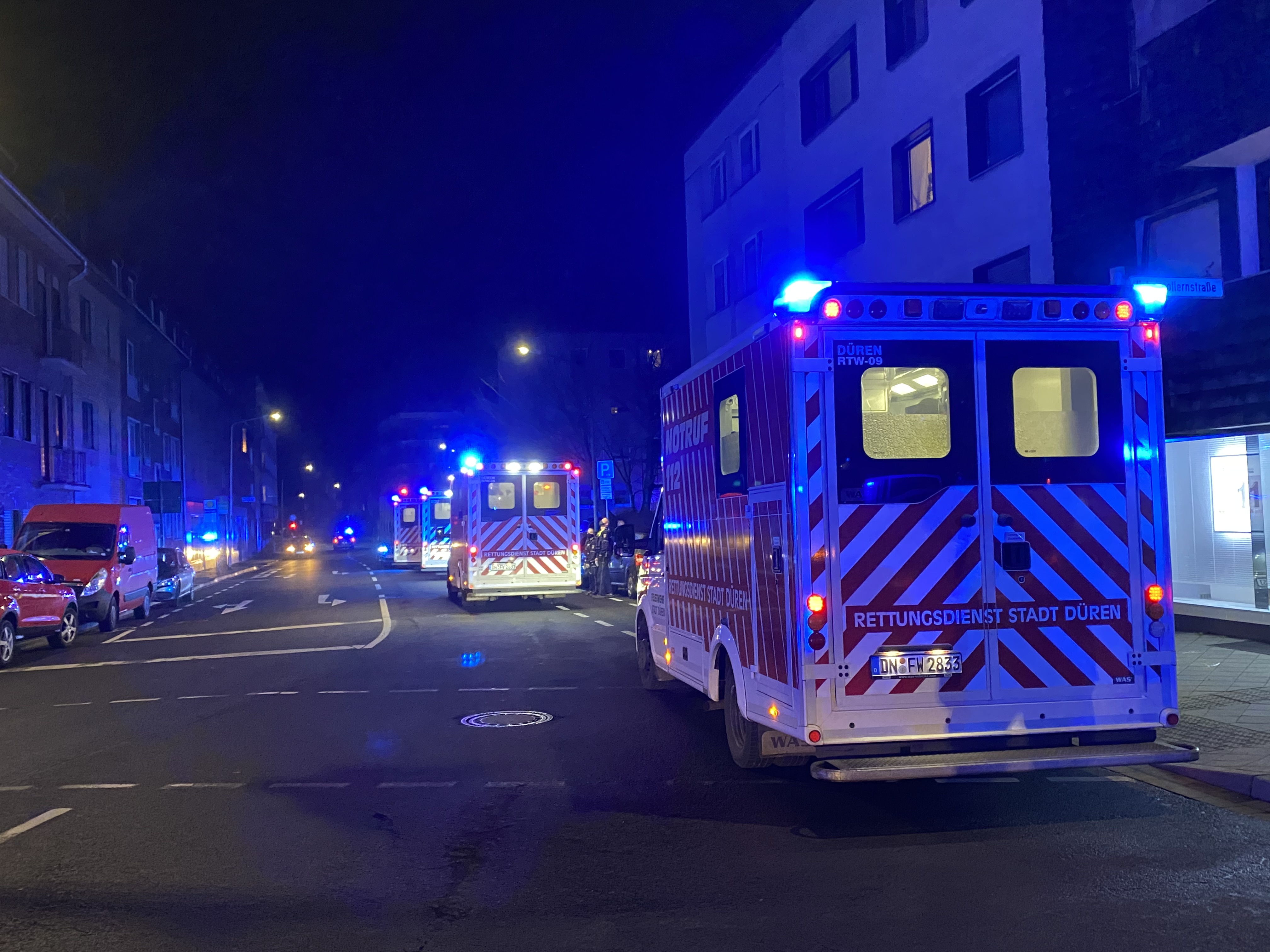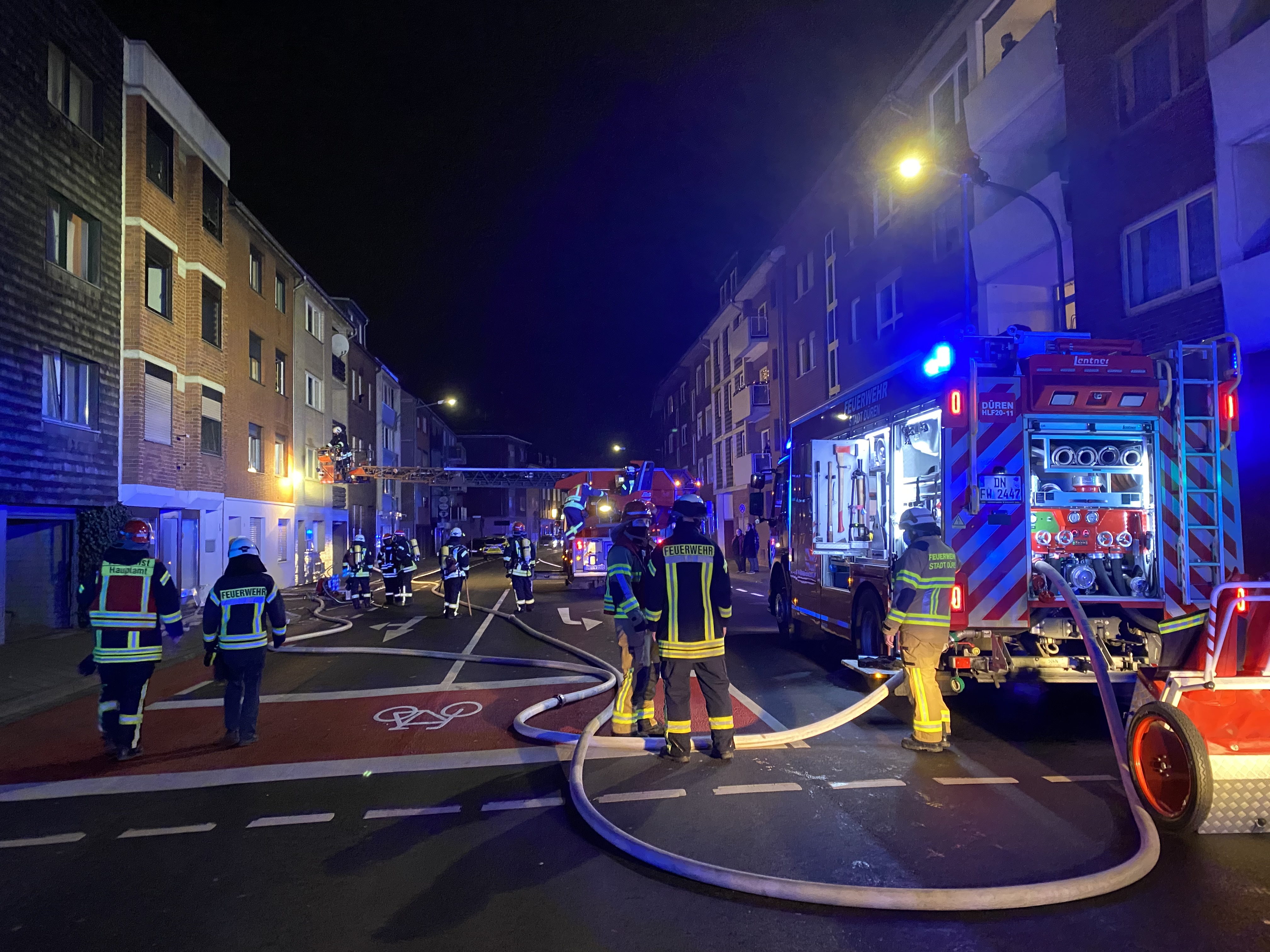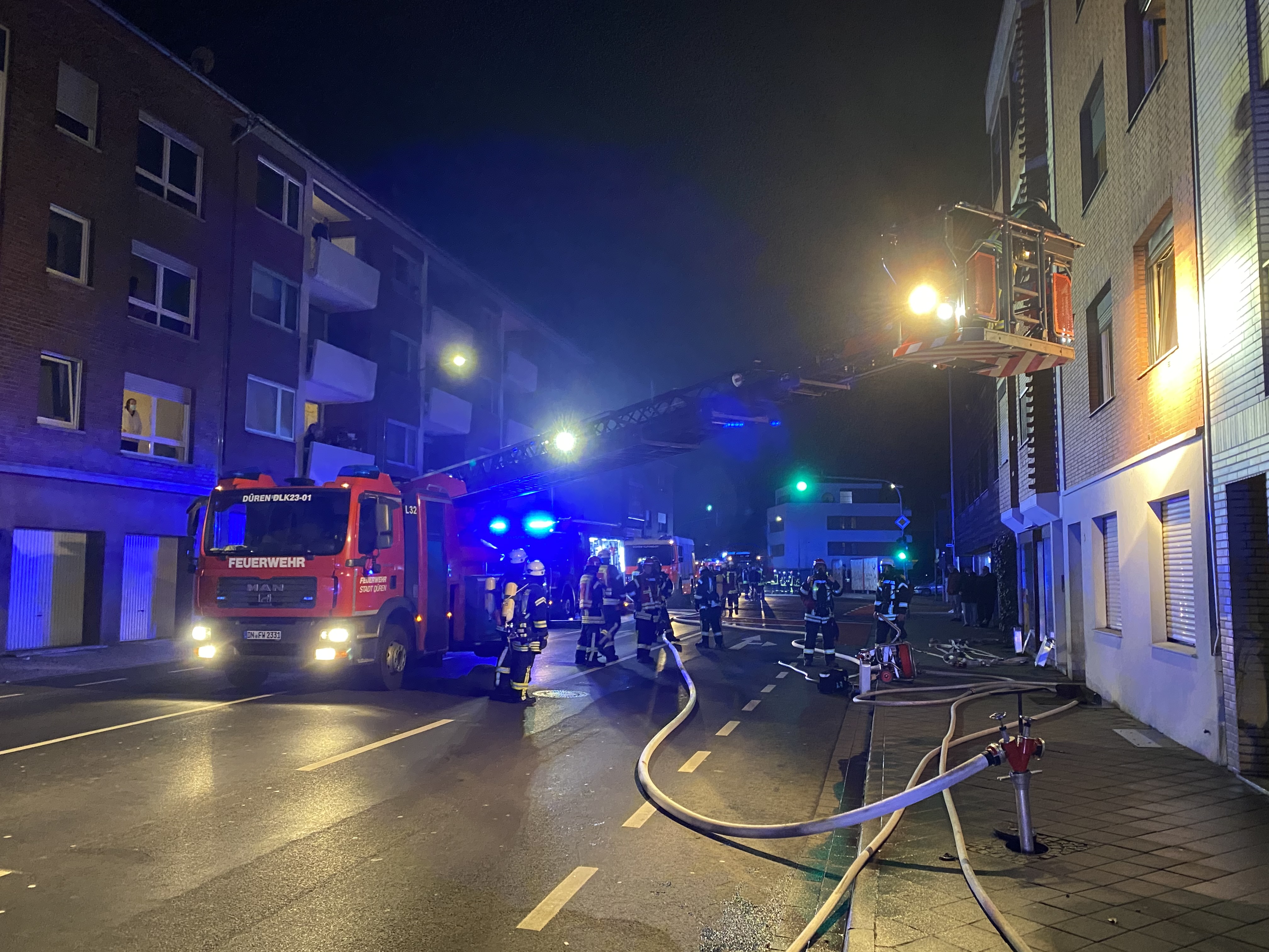 der Feuerwehr Düren war ein deutlicher Zimmerbrand festzustellen. Unmittelbar wurde das Feuer durch Trupps unter Atemschutz im Innenangriff bekämpft. Der Brand konnte rasch unter Kontrolle gebracht werden. Parallel waren mehrere Trupps unter Atemschutz im Einsatz um Menschen zu retten. Über die Drehleiter wurden 7 Personen gerettet, eine Person konnte sich selber retten. Eine Person wurde mit Brandverletzungen zur weiteren Behandlung in die Uniklinik Aachen transportiert. Die restlichen Personen wurden in umliegende Krankenhäuser transportiert. Es brannte in einer Wohnung im 1. Obergeschoss. Das direkte Eingreifen führte dazu, dass der Brand auf dem vorgefundenen Bereich eingegrenzt werden konnte. Aufgrund der starken Verrauchung, wurde durch die Feuerwehr eine umfangreiche Belüftung durchgeführt. Insgesamt waren die Feuerwehr Düren und der Rettungsdienst mit rund 75 Einsatzkräfte vor Ort.
