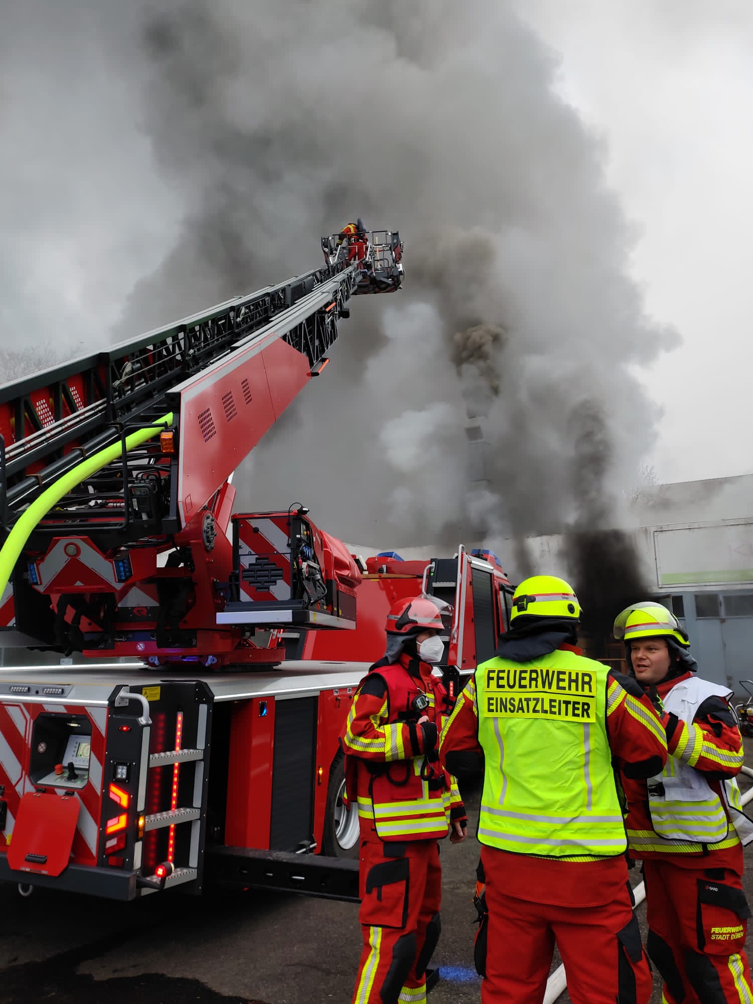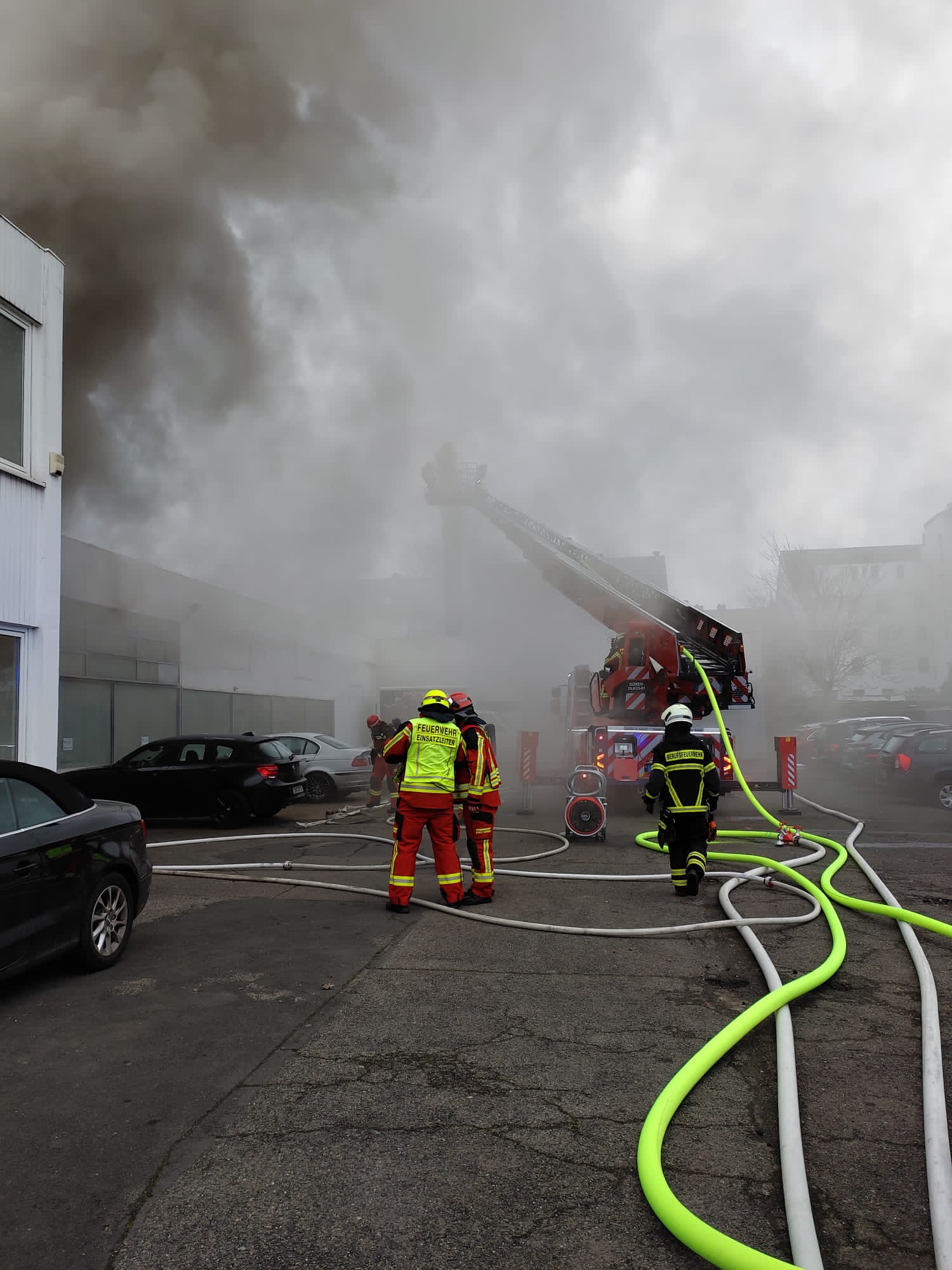 Platz) gerufen. Vor Eintreffen der Feuerwehr hatten sich bereits alle Betriebsangehörigen aus dem Objekt selbstgerettet. Die Lackierkabine, die sich in einer ca. 2.000 m² großen Halle befand, stand im Vollbrand; dichter, schwarzer Rauch drang aus den Öffnungen des Objektes und breitete sich auf den Bereich "Roonstrasse" aus. Nach der Erkundungsphase wurde ein umfangreicher Löschangriff vorgetragen; in diesem Verlauf wurden bis zu 6 Strahlrohre von den Einsatzkräften unter Atemschutz eingesetzt. Die Nachbarschaft wurde durch eine vorsorglich in Stellung gebrachte Riegelstellung gesichert. Aufgrund der starken Rauchentwicklung wurden durch die Messeinheit der Feuerwehr Kreuzau umfangreiche Messungen im Umfeld der Einsatzstelle durchgeführt. Das Krankenhaus Düren und ein in der Nähe befindliches Altenheim wurden informiert. Die Bevölkerung wurde über die NINA App zum schließen der Fenster aufgefordert. Nach ca. 1,5 Stunden konnte der Leitstelle "Feuer unter Kontrolle" gemeldet werden. Anschließend waren umfangreiche Nachlösch- und Lüftungsarbeiten erforderlich. Im Einsatz war die gesamte Feuerwehr Düren, der Messzug der Feuerwehr Kreuzau sowie das Feuerwehrtechnische Zentrum des Kreises Düren mit Sonderfahrzeugen. Die Einsatzkräfte wurden durch die Johanniter aus Düren mit Warmgetränken versorgt. Im Einsatz waren rund 100 Einsatzkräfte. Die Polizei hat die Ermittlungen zur Brandursache aufgenommen.