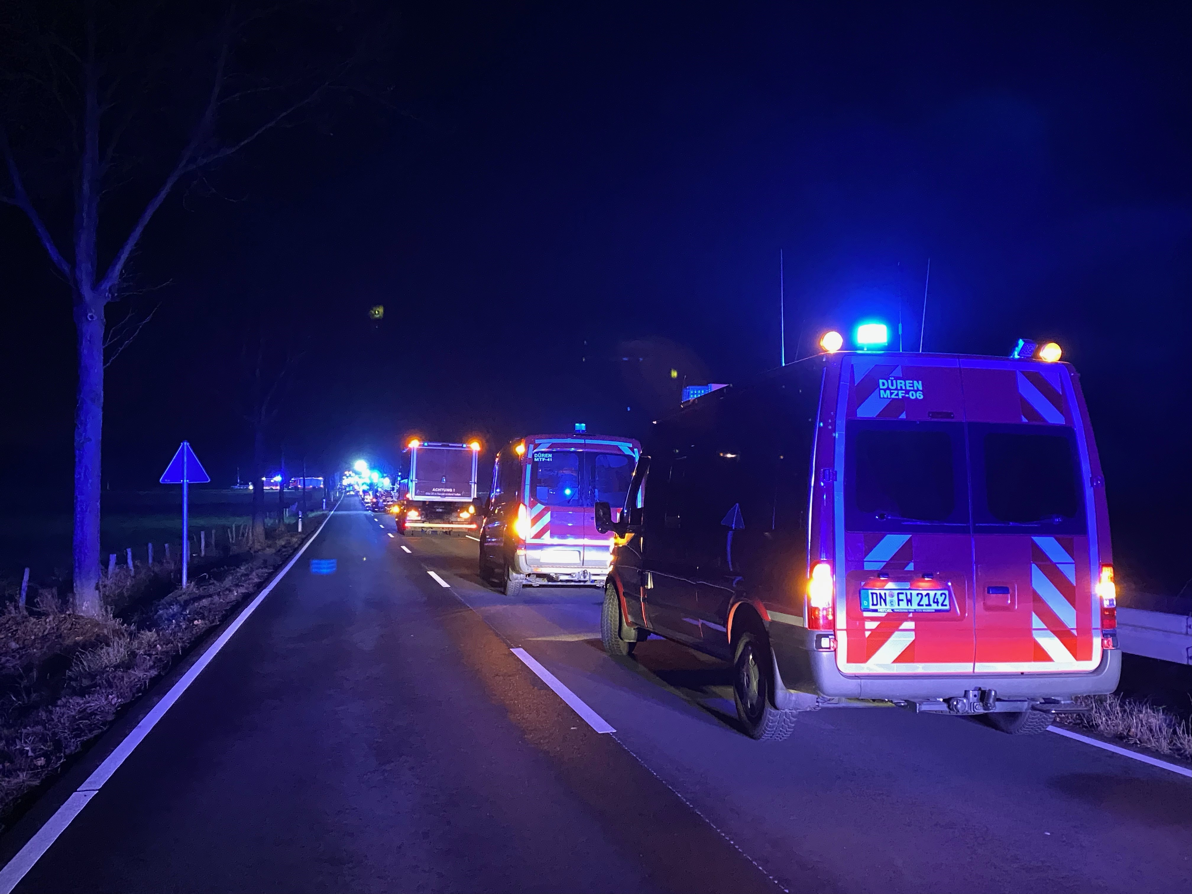 Am späten Samstag Abend wurde die Feuerwehr Düren zu einem Verkehrsunfall auf der Monschauer Landstraße alarmiert. Dort war ein PKW aus bislang unbekannten Gründen von der